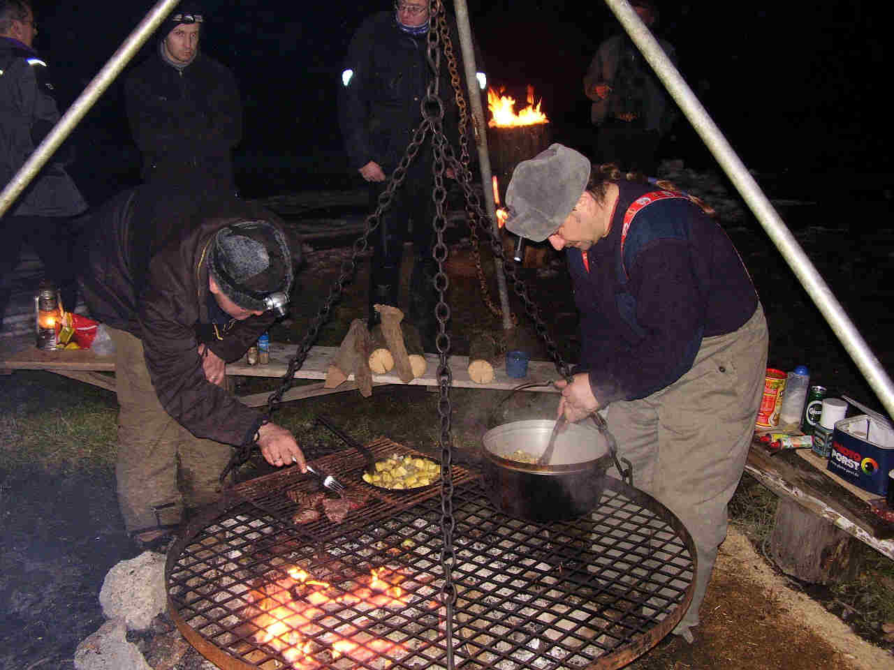 Am Samstag Abend dann die beiden Höhepunkte unseres Treffens. 1. Uwes Krautpfanne ! und für diejenigen die zu wenig Geduld hatten kochte Andreas noch geschwind ein paar Straussensteaks mit Bratkartoffeln, D A N K E den Köchen, und allen die in der "Küche" mitgeholfen haben